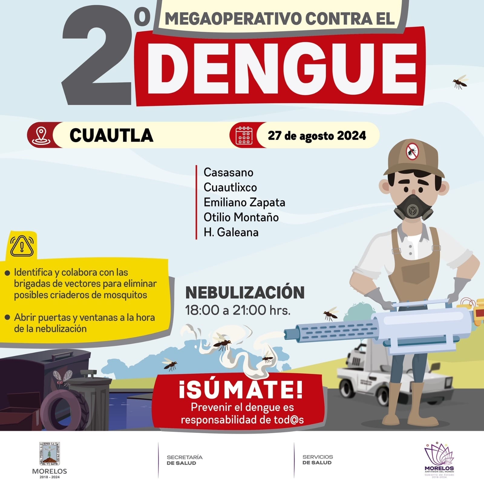 La Secretaría de Salud, a través de Servicios de Salud de Morelos (SSM), informó que se realizará un segundo megaoperativo en el municipio de Cuautla, del 26 al 28 de agosto, para eliminar criaderos de mosquitos que transmiten la enfermedad del dengue, zika y chikungunya.
