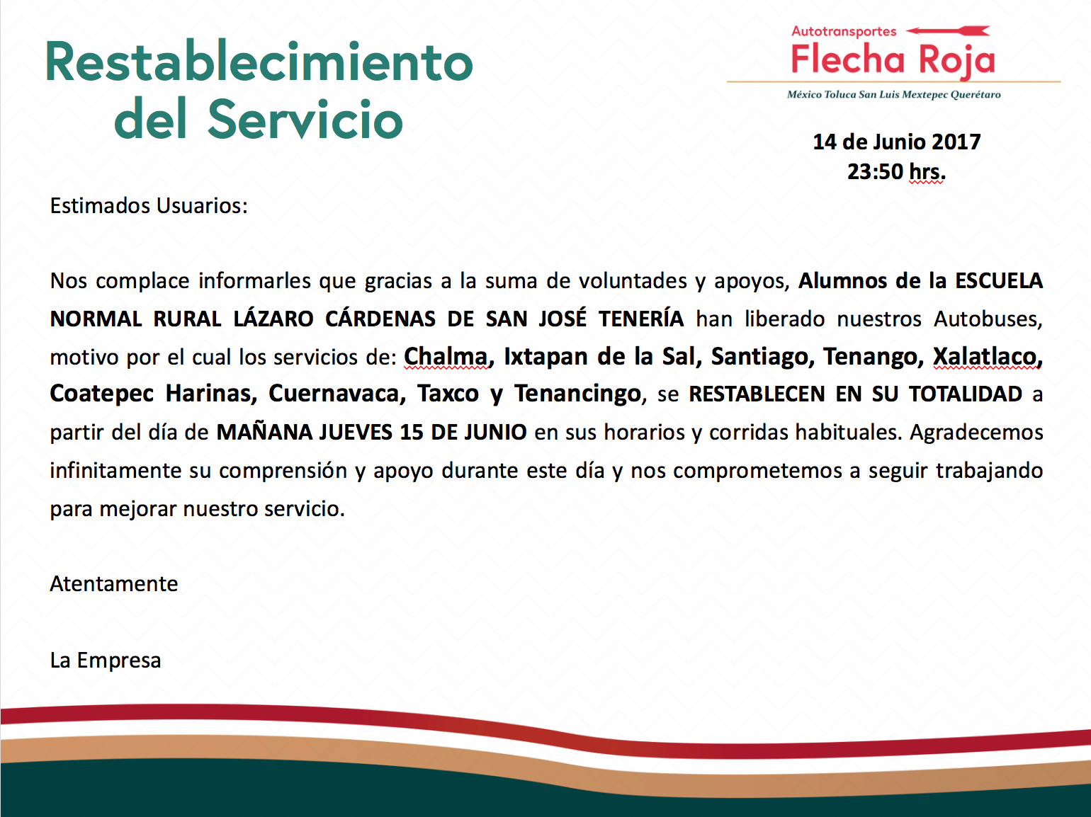 A través de un comunicado la empresa de transporte “Flecha Roja” informó que han sido liberados los camiones secuestrados por alumnos de la Normal de San José Tenería.