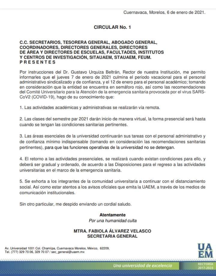 El escrito indica que las vacaciones para el personal administrativo, tanto sindicalizado como de confianza, termina este jueves 7 de enero. Además para el personal académico las vacaciones culminan hasta el martes 12 de enero. También se informa que las áreas esenciales de la universidad continuarán laborando de manera presencial pero con personal reducido y medidas de salubridad.
