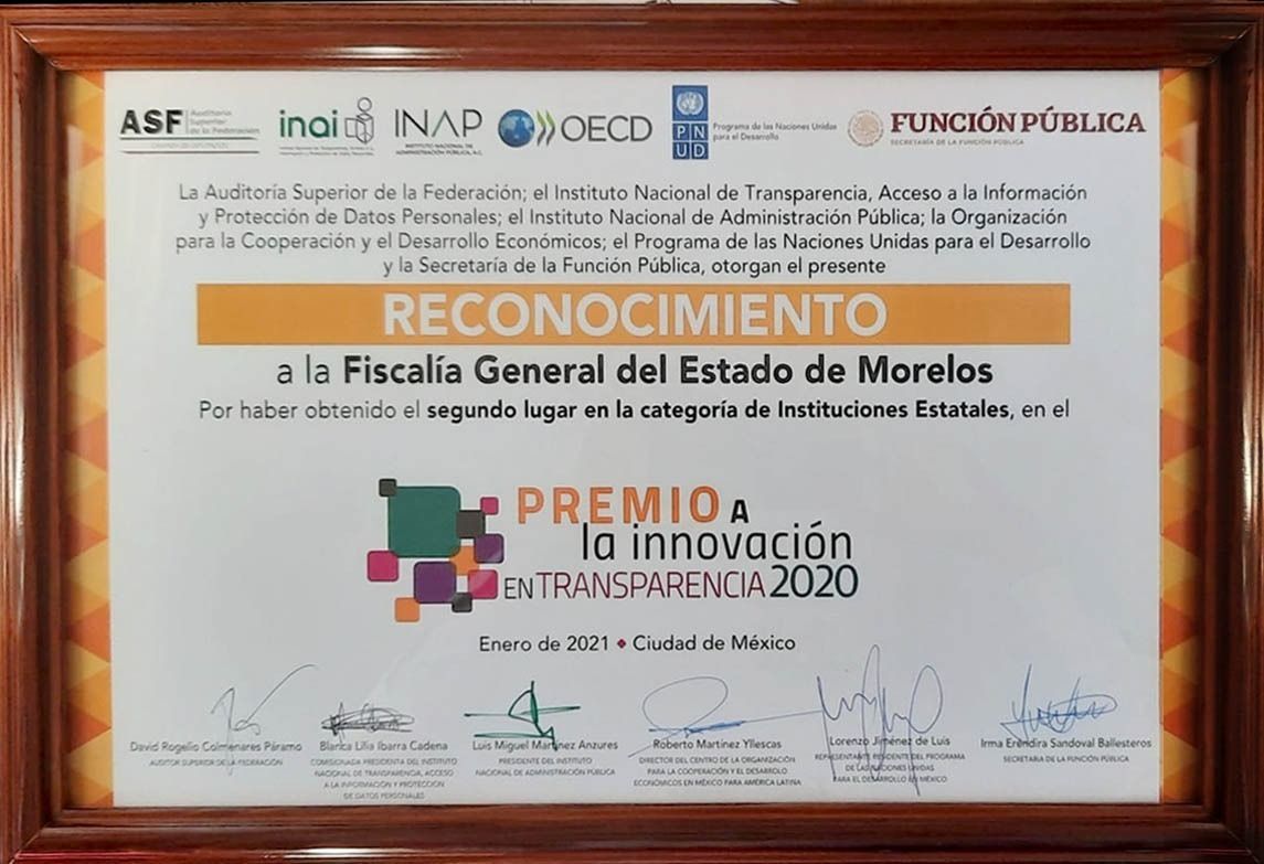 El Instituto Nacional de Transparencia, Acceso a la Información y Protección de Datos Personales INAI, entregó de manera virtual el Premio a la Innovación en Transparencia 2020 a la Fiscalía General del Estado y al Instituto de la Mujer para el Estado de Morelos, por el trabajo en conjunto realizado para la “Plataforma de Datos de Feminicidios en el Estado de Morelos”.