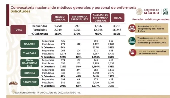 El director del IMSS también mencionó que para la Convocatoria Nacional para Médicos generales, Enfermeras y Enfermeros especialistas y Auxiliares de enfermería, se postularon 2,949 profesionales de la salud; los cuales estarán cubriendo vacantes en los Estados de Nayarit, Tlaxcala, Baja California Sur, Sonora y Campeche.