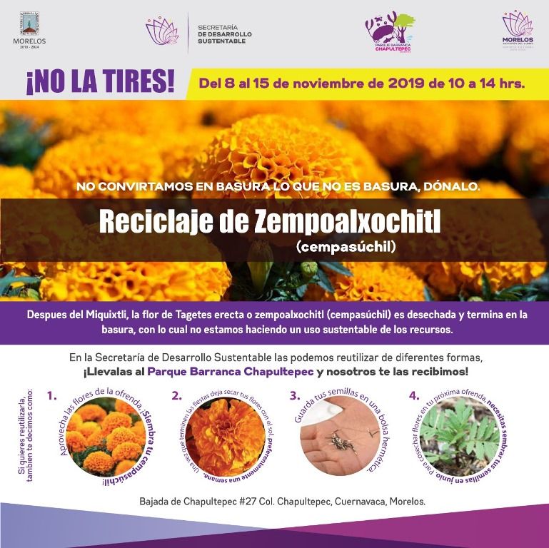 ¡No tires tus flores de cempasúchil! Ayuda al medio ambiente llevándolas al Parque Barranca Chapultepec, de Cuernavaca, donde reciclarán tus flores dándoles un tratamiento especial para recolectar sus semillas y sembrarlas para el siguiente año.