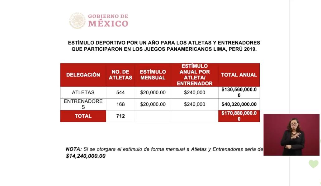 Asimismo, el jefe del Ejecutivo destacó que se entregará un apoyo de 20 mil pesos mensuales a 168 entrenadores, aplaudiendo su labor, ya que se lograron 14 plazas directas a Tokio 2020.