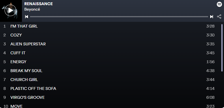 Renaissance apuesta por el funk, rap y el pop. No obstante, el álbum se coronan con el choque de sonidos atrevidos que trasladan a todo aquel que lo escucha a un ambiente de verano desinhibido. Ejemplo claro es “CHURCH GIRL” y “PURE/HONEY”, en donde los vocales se combinan a la perfección con sonidos sexys y una letra de impacto.