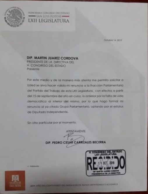 La tarde de este lunes, el diputado local Pedro César Carrizales Becerra, mejor conocido como “El Mijis”, presentó su renuncia de manera formal a la bancada del Partido del Trabajo (PT), lo que lo convertiría en diputado local independiente de San Luis Potosí.