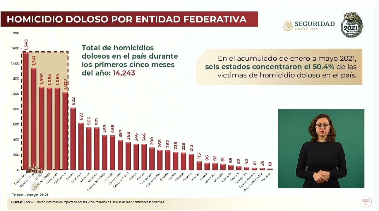 En total, suman 14 mil 243 homicidios de enero a mayo de este año, de los cuales el 50.4 % se concentraron en seis estados.