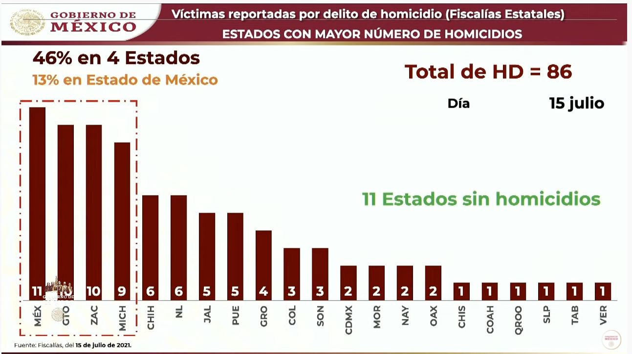 Tan solo el día de ayer se reportaron 86 homicidios dolosos, de los cuales el 46 % se concentró en solo 4 estados, mientras que en 11 entidades no hubo reporte de casos.
