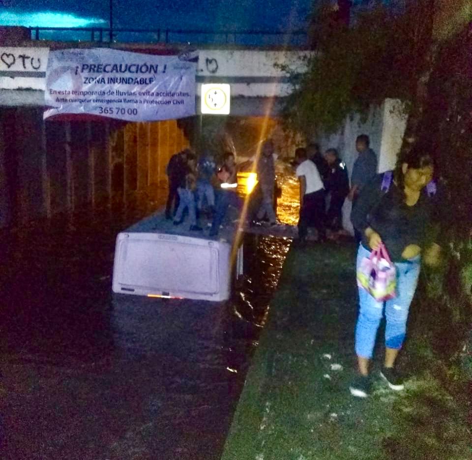 Al menos 30 pasajeros tuvieron que escalar hasta la parte más alta del autobús, para ser rescatados por elementos de Protección Civil, solo minutos antes de que el nivel del agua terminara por inundar el vehículo. Por fortuna todos lograron salir y solo se reportaron lesiones leves.