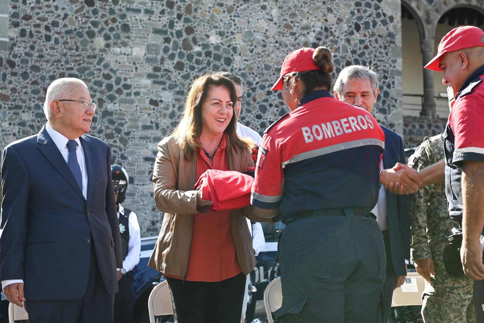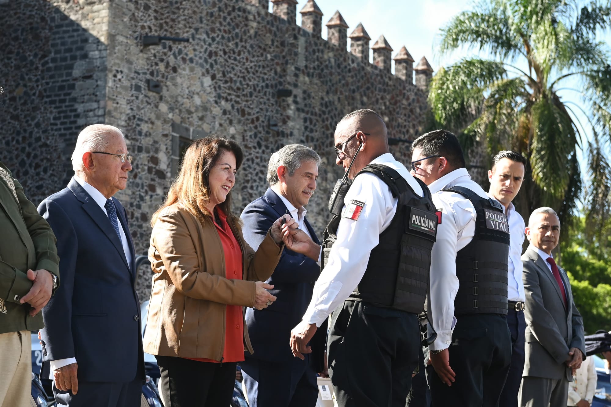 La gobernadora Margarita González Saravia refrendó el compromiso de colaboración con el municipio de Cuernavaca para fortalecer la seguridad de la población de la capital y de todo el estado. Lo anterior, al asistir como invitada a la entrega de unidades vehiculares y uniformes a elementos de la Secretaría de Protección y Auxilio Ciudadano (SEPRAC), acto encabezado por el presidente municipal José Luis Urióstegui Salgado.
