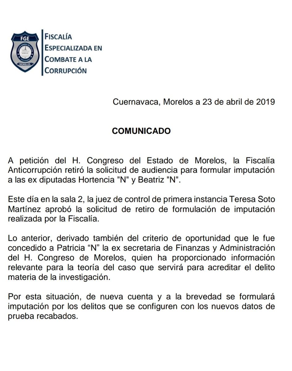 A través de un comunicado por parte de la Fiscalía Especializada en el Combate a la Corrupción, se retiró la solicitud de audiencia para formular imputación a las ex diputadas perredistas, Hortencia Figueroa Peralta y Beatriz Vicera Alatriste, a petición del Congreso del Estado de Morelos.