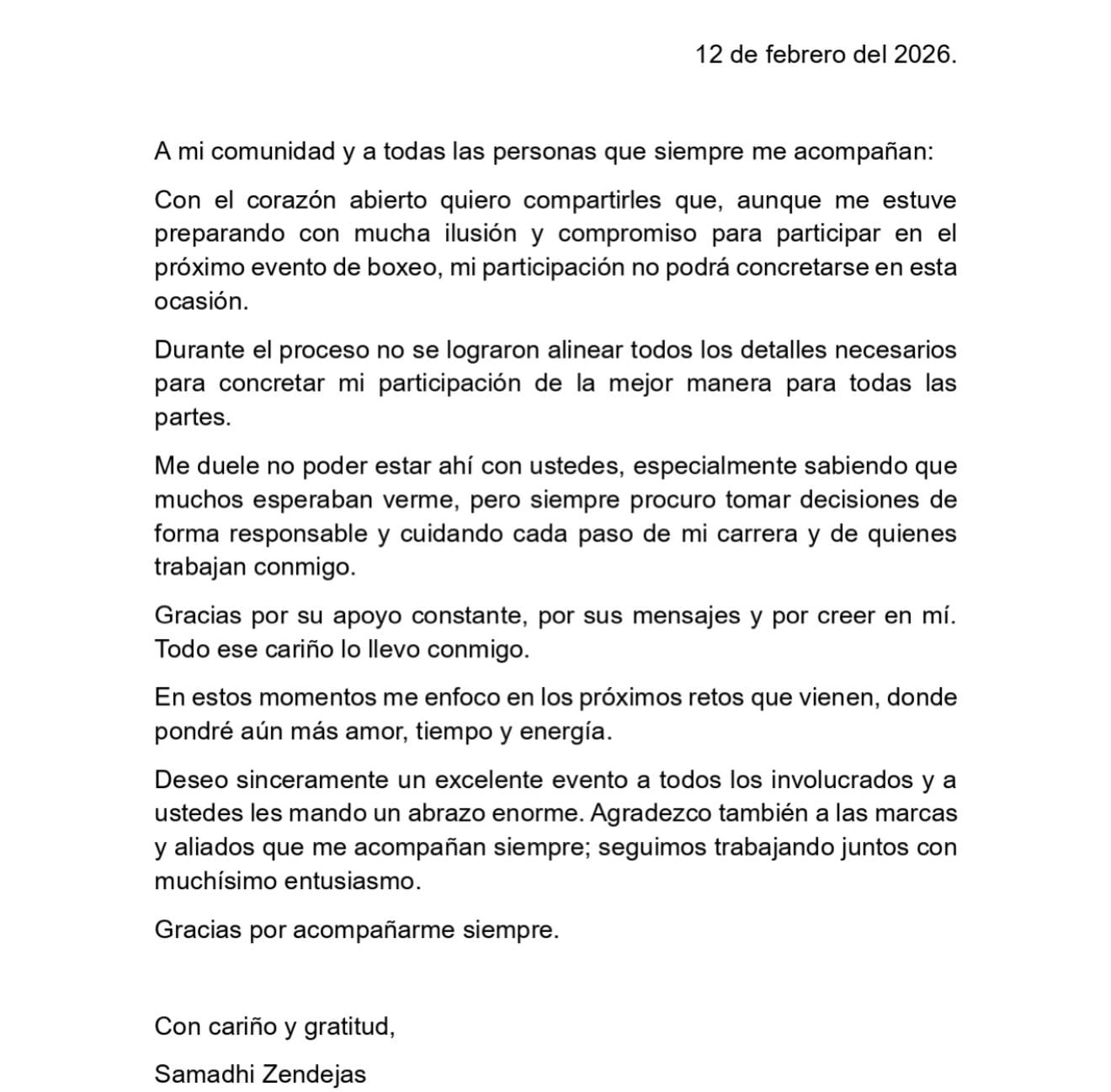 A través de un comunicado en redes sociales, Zendejas explicó que, pese a haberse preparado “con ilusión y compromiso”, su participación “no podrá concretarse”, ya que durante el proceso “no se lograron alinear todos los detalles necesarios” para cerrar el acuerdo en los términos que ella y su equipo consideraban adecuados.