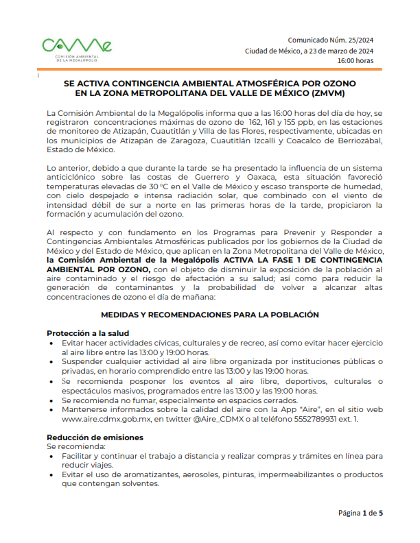 La Comisión Ambiental de la Megalópolis, informó esta tarde que, con datos al corte a las 16:00 horas, se registraron concentraciones máximas de ozono de 162, 161 y 155 ppb, de acuerdo a las estaciones de monitoreo de la calidad del aire. Por lo que se activa la fase 1 de contingencia ambiental por ozono.