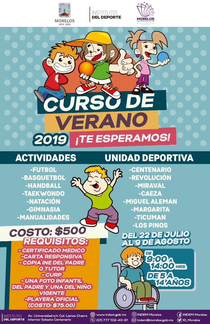 El Instituto del Deporte y Cultura Física del Estado de Morelos (INDEM) anunció la realización del “Curso de Verano 2019”, el cual se impartirá a menores de edad desde los 5 hasta los 14 años de edad, en ocho diferentes unidades deportivas que este organismo del Gobierno Estatal administra.