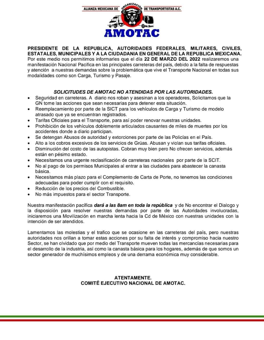 Asimismo, la AMOTAC comunicó a través de un oficio que la protesta comenzará este martes y que, de no encontrar una vía para el diálogo con las autoridades, iniciarán una movilización hacia la Ciudad de México.