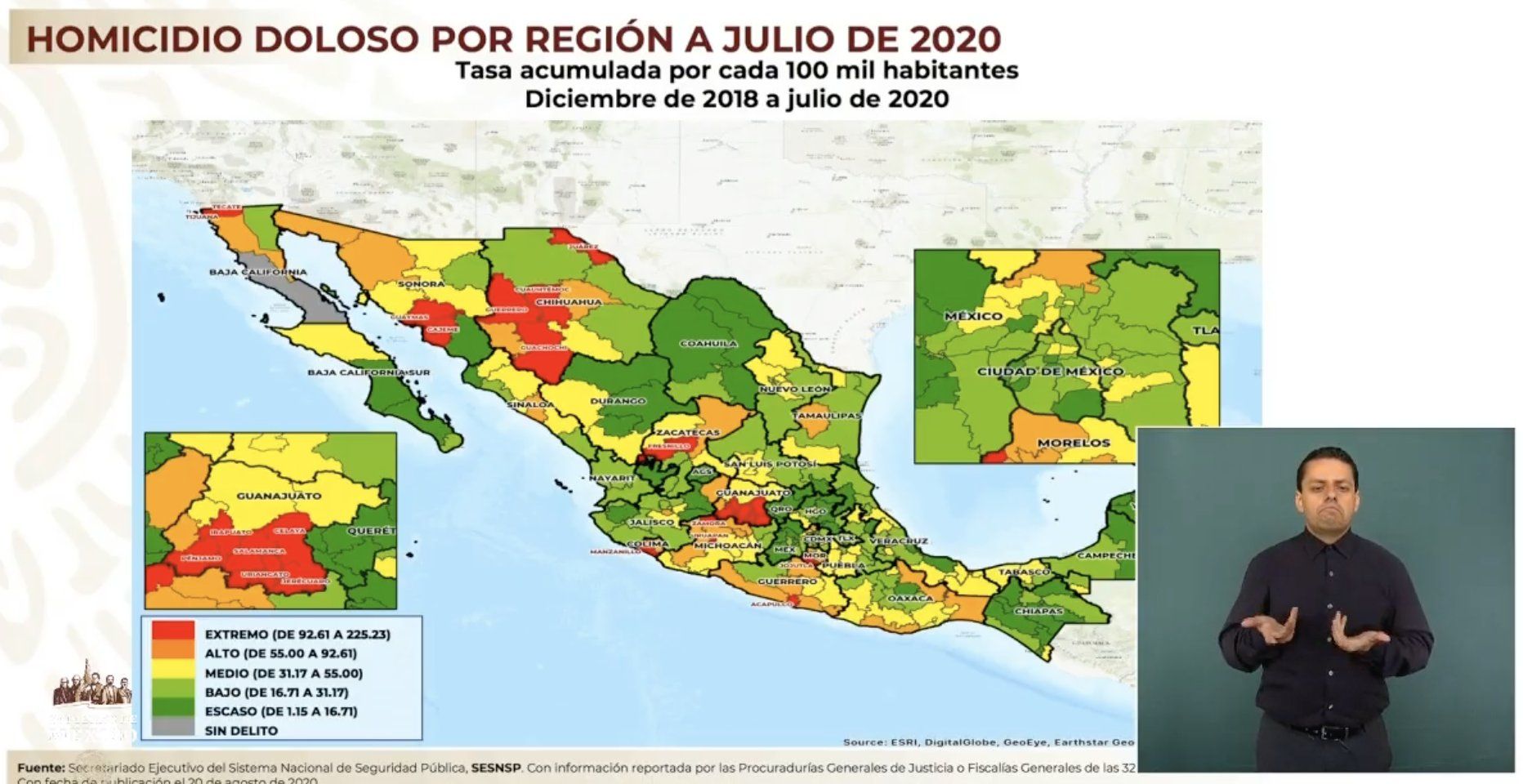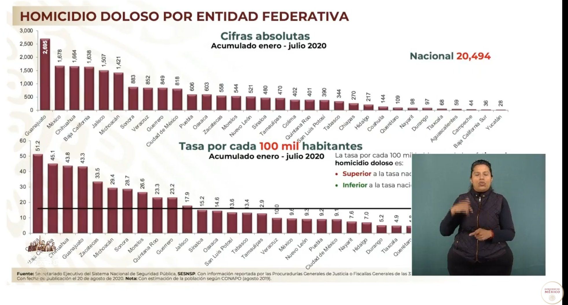 A nivel nacional se registraron 20 mil 494 asesinatos dolosos durante julio, siendo Guanajuato; Estado de México; Chihuahua; Baja California y Jalisco las entidades federativas con más eventos. Por el contrario, se encuentra Yucatán, Baja California Sur y Campeche.