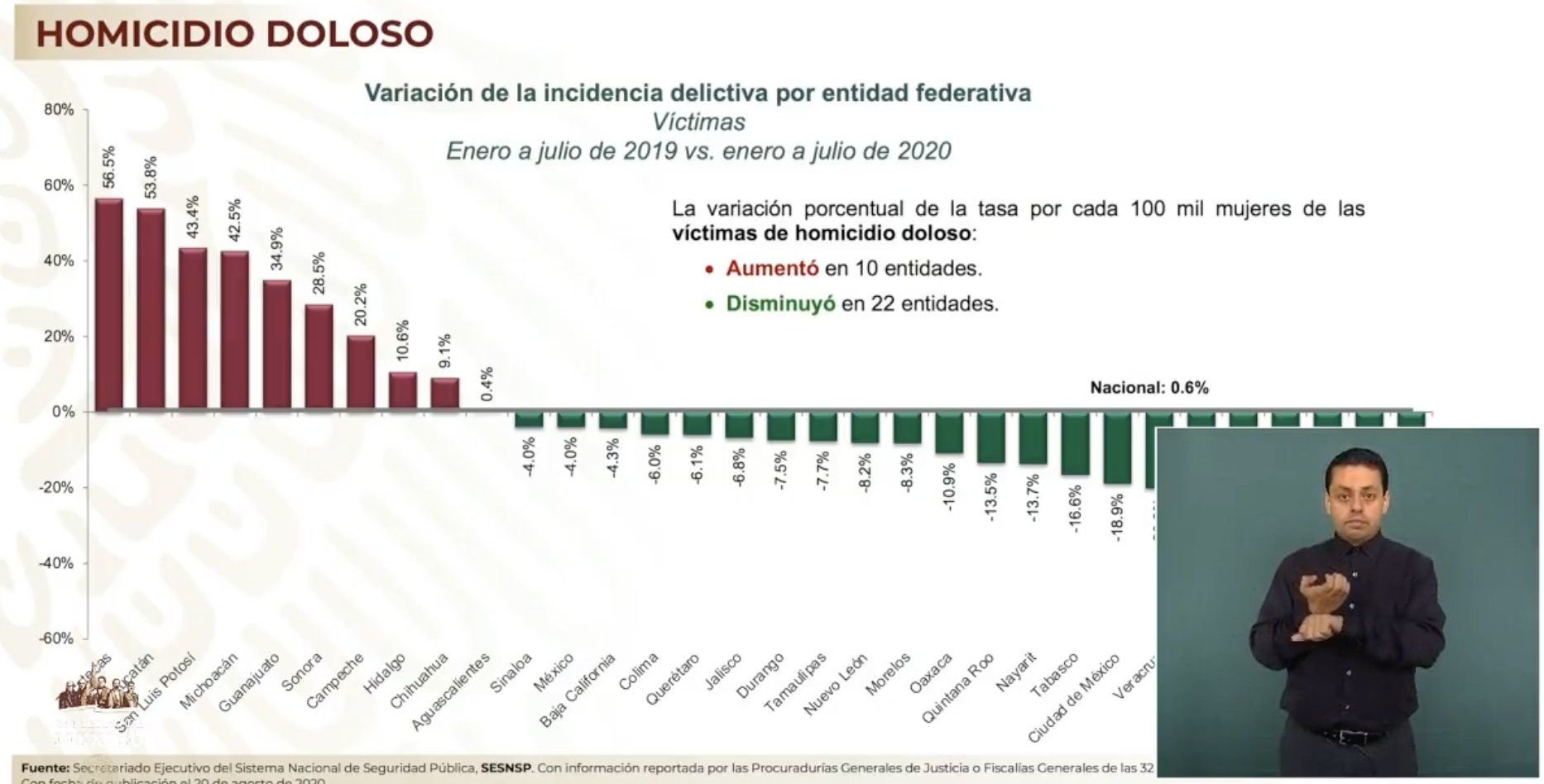 Durante La Mañanera de hoy, el secretario de Seguridad, Alfonso Durazo, informó que en el mes de julio se registró un ligero repunte del 0.1 % en los homicidios dolosos a nivel nacional.