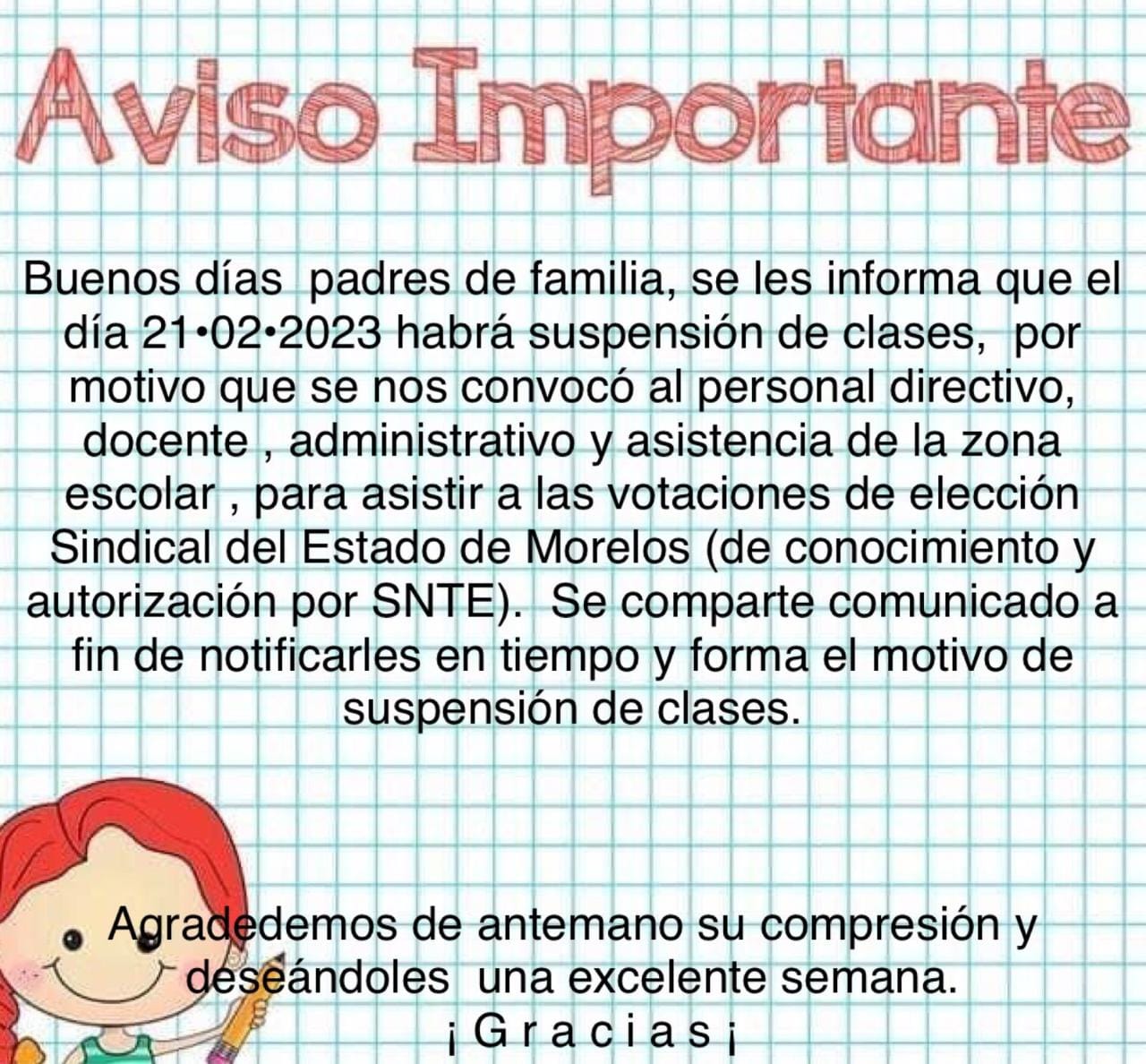 Por lo que el personal directivo, administrativo, docente y asistencia de la zona escolar está convocado a asistir a las votaciones de elecciones, suspenderán sus actividades quedando sin clases cerca de 350 mil niñas y niños, el miércoles 22 de febrero del presente año se reanudarán las actividades.