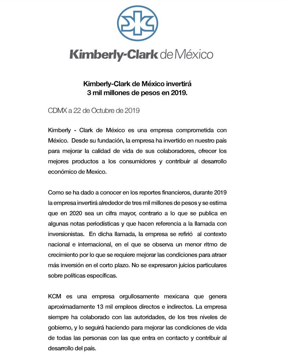 A través de un comunicado, la empresa internacional Kymberly Clark aclaró que no dejará de invertir en México, al contrario, aumentará su presupuesto para nuestro país en 2020.