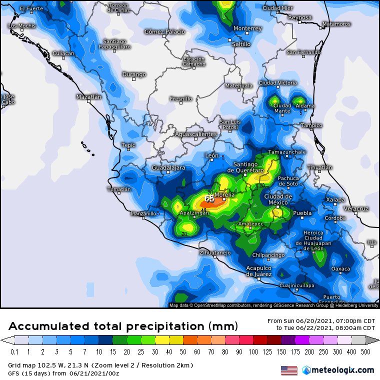 Se espera que las más fuertes tormentas se desarrollen en Coahuila, Nuevo León, Guanajuato, Michoacán, Querétaro, Hidalgo, Estado de México, Ciudad de México, Morelos, Puebla, Tlaxcala, Oaxaca, Guerrero, Jalisco, San Luis Potosí, Tamaulipas, Sonora, Chihuahua, Sinaloa y Durango.