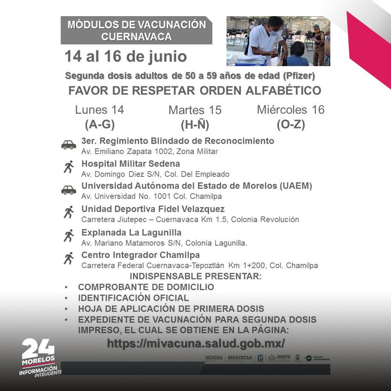 Autoridades encargadas de la vacunación en Morelos anunciaron que del 14 al 16 de junio se aplicará la segunda dosis a adultos de 50 a 59 años de edad para los habitantes de Cuernavaca.