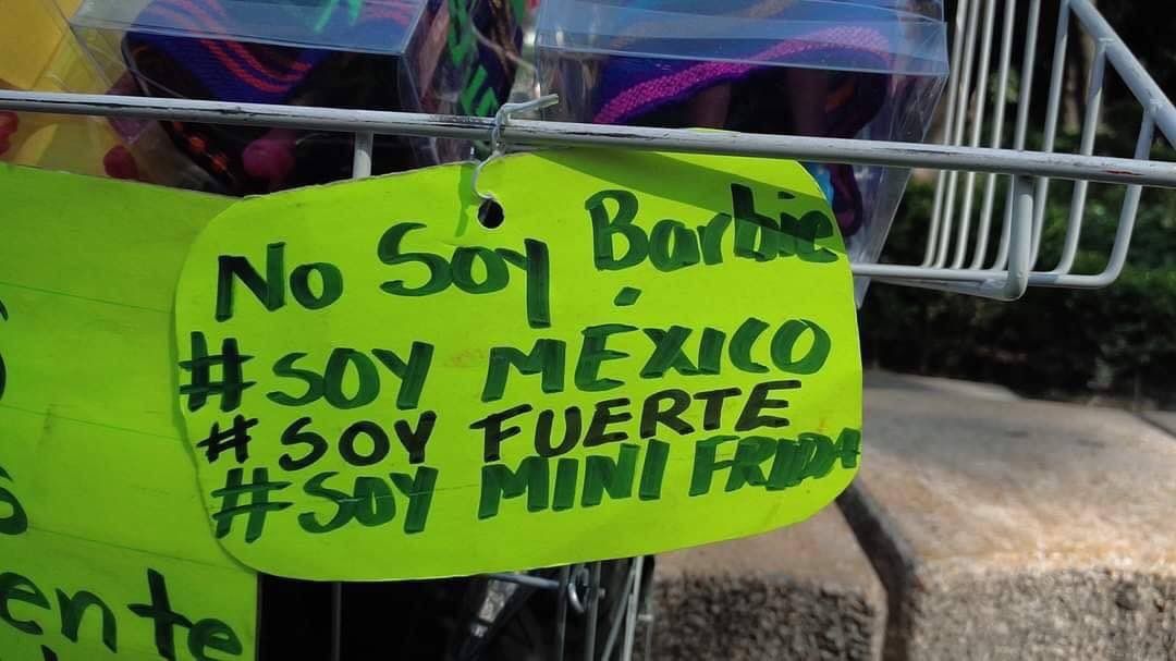 Según la publicación, la señora promociona sus muñecas afirmando que no se trata de Barbies, sino hechas artesanalmente en México: “No soy Barbie, #SoyMéxico, #SoyFuerte, “SoyMiniFrida”, se lee en la cartulina.