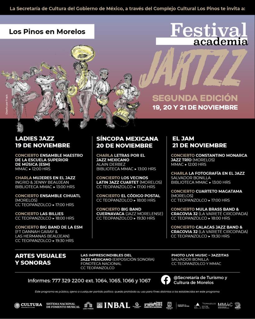 Del viernes 19 al domingo 21 de noviembre del presente año, se llevará a cabo la segunda edición del Festival Academia Jartzz. Este festival de jazz será presentado en el Centro Cultural Teopanzolco y el Museo Morelense de Arte Contemporáneo.