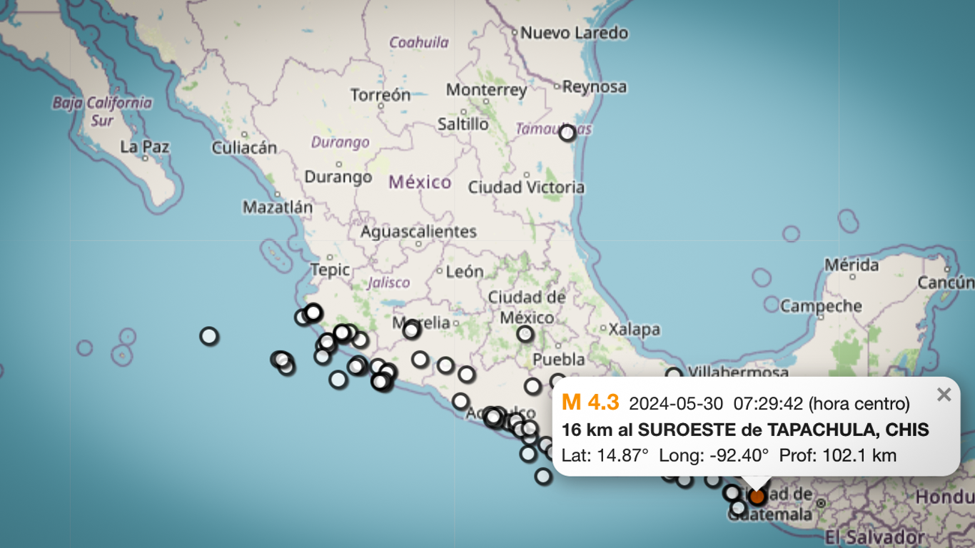 La actividad tectónica este jueves 30 de mayo presentó una tendencia a la baja respecto al día de ayer en el que se presentaron 108 temblores en nueve entidades de México.