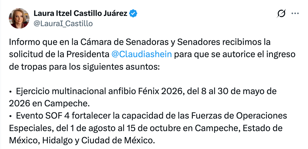 La presidenta de la Mesa Directiva del Senado, Laura Itzel Castillo Juárez, informó que la Cámara de Senadoras y Senadores recibió una solicitud de la presidenta Claudia Sheinbaum Pardo para autorizar el ingreso de personal militar extranjero a territorio nacional con fines de capacitación y ejercicios conjuntos.