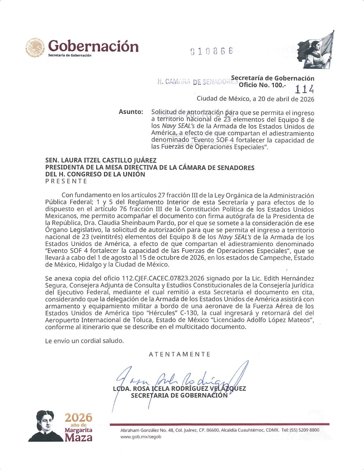 De acuerdo con el documento enviado por la Secretaría de Gobernación, se plantea permitir la entrada de 23 elementos del Equipo 8 de los Navy SEALs de Estados Unidos, quienes participarían en actividades de adiestramiento denominadas “Evento SOF 4”, enfocadas en fortalecer las capacidades de las Fuerzas de Operaciones Especiales.