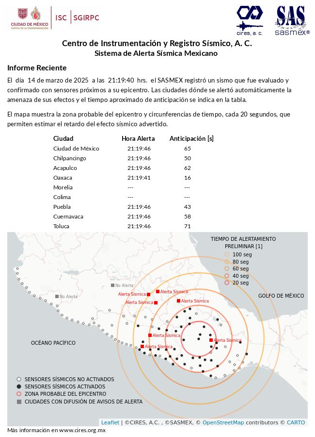 Por su parte, el Sistema de Alerta Sísmica Mexicano (SASMEX) activó la alerta la noche del 14 de marzo tras detectar un sismo a las 21:19:40 horas. La alerta fue emitida en diversas ciudades con anticipación variable según la distancia al epicentro.