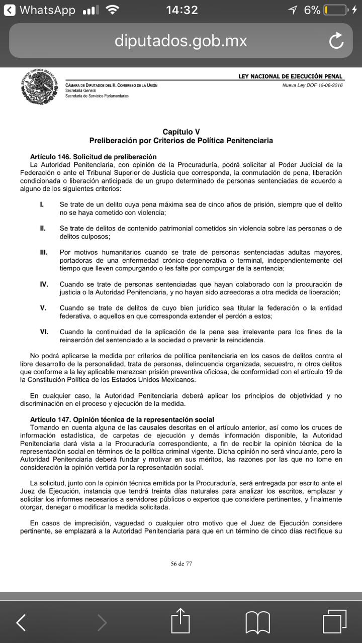 Dicha solicitud se dice sustentada en el artículo 146 de la Ley Nacional de Ejecución Penal, por lo que con el objetivo de hacer respetar los derechos de los reclusos ante la crisis sanitaria, se podría solicitar al Poder Judicial la liberación condicionada o anticipada de los sentenciados.