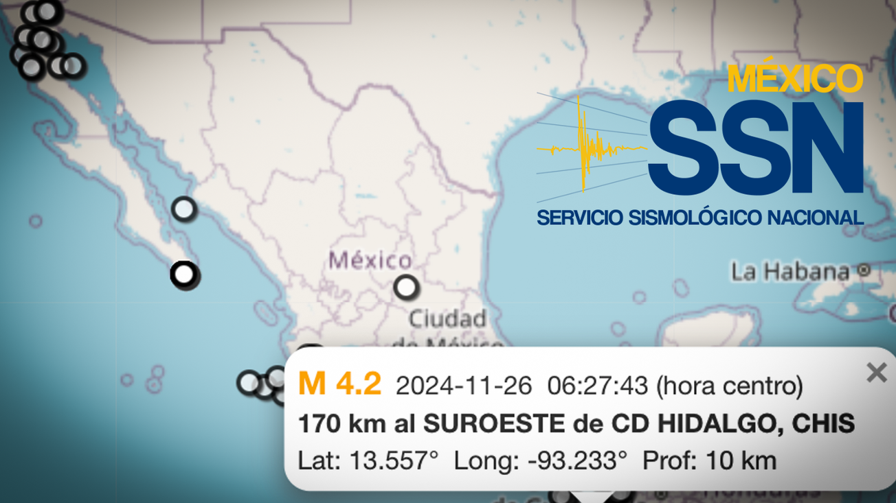 Durante este martes 26 de noviembre, el Servicio Sismológico Nacional (SSN) registró 59 movimientos tectónicos en nueve entidades del país, con magnitudes que oscilaron entre 1.3 y 4.2.