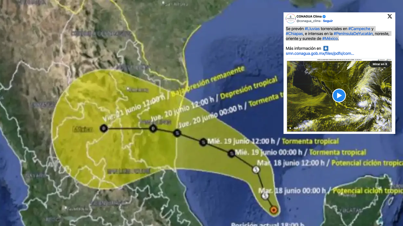 "Se prevén Lluvias torrenciales en Campeche y Chiapas, e intensas en la Península de Yucatán, noreste, oriente y sureste de México", informó la CONAGUA. Debido a lo anterior, las secretarías de educación de diversos estados emitieron comunicados esta tarde anunciado la medida preventiva.