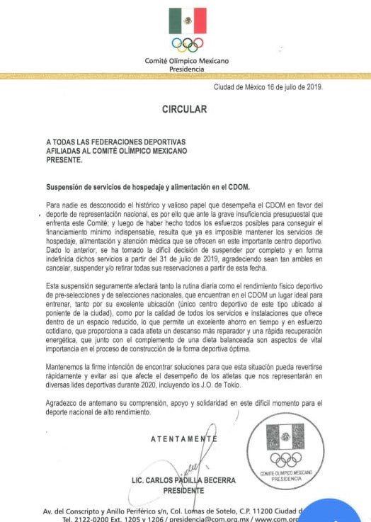 Lamentablemente, el recorte presupuestal del Gobierno Federal al deporte durante este sexenio, ha obligado a tomar la decisión de suspender los servicios de hospedaje, alimentación y atención médica, misma acción que ya se había anticipado hace un mes tras la falta de recursos.