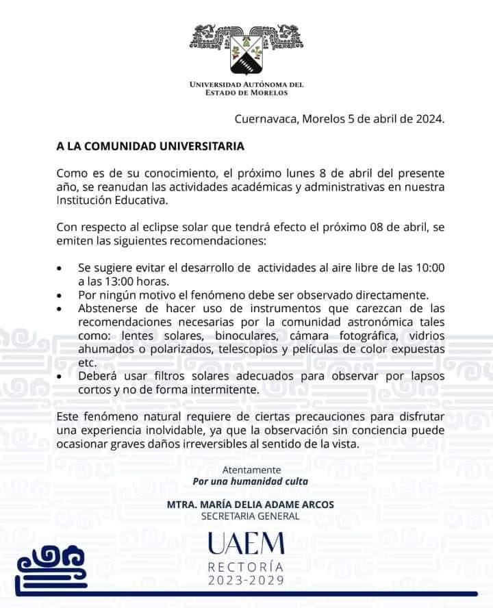 En caso de que deseen observar el fenómeno astronómico, piden a la comunidad universitaria lo hagan con los filtros adecuados y por lapsos cortos y no de forma intermitente.