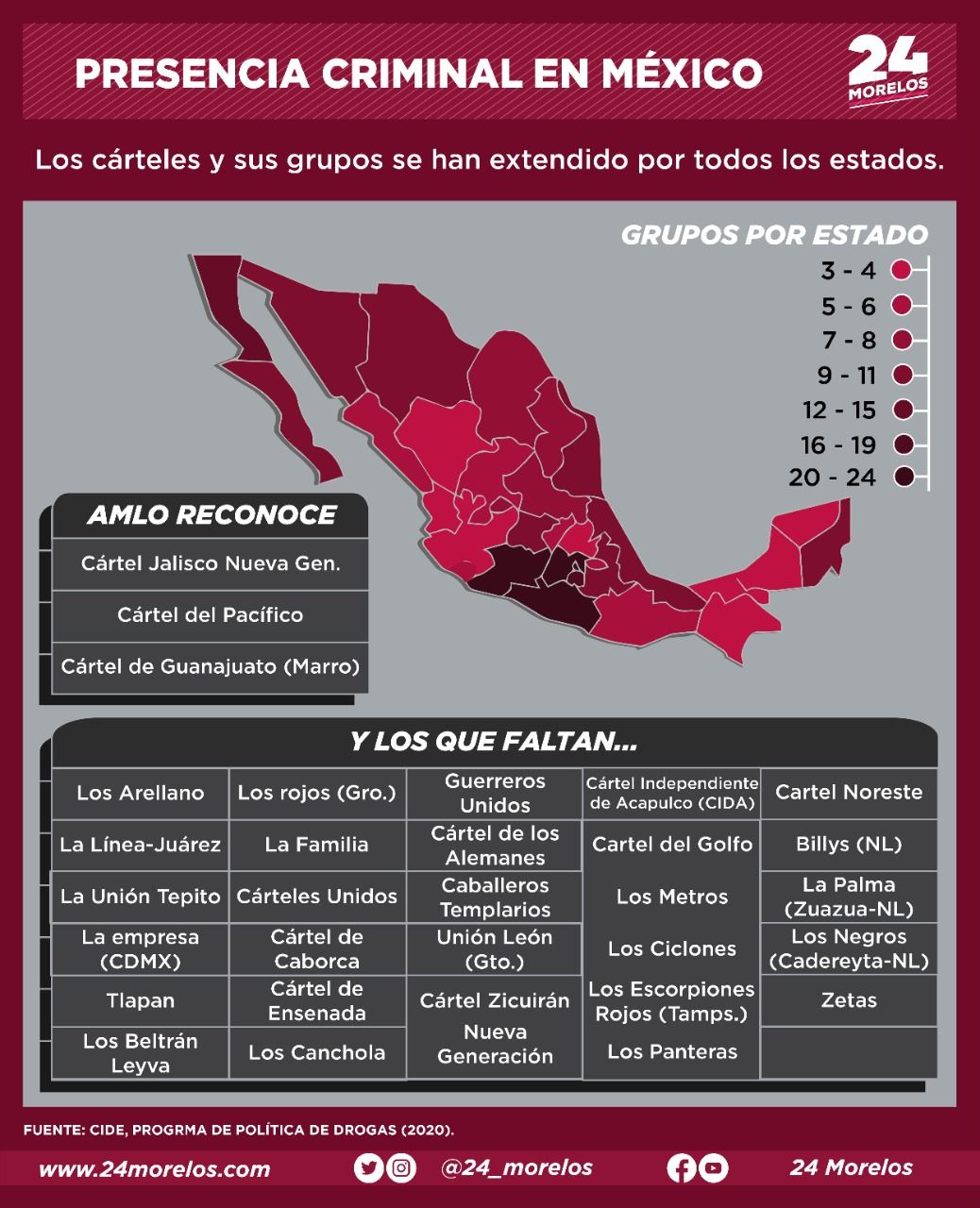 Y es que seamos sinceros, hay temas que no se han reconocido y muchos menos tratado, un ejemplo de ello son los carteles de la droga, mismos que, mientras el presidente solo reconoce a tres, expertos señalan que son al menos 20 células delictivas las que tienen presencia en México y las más grandes se han expandido en zonas donde antes no se consideraban como “focos rojos”.