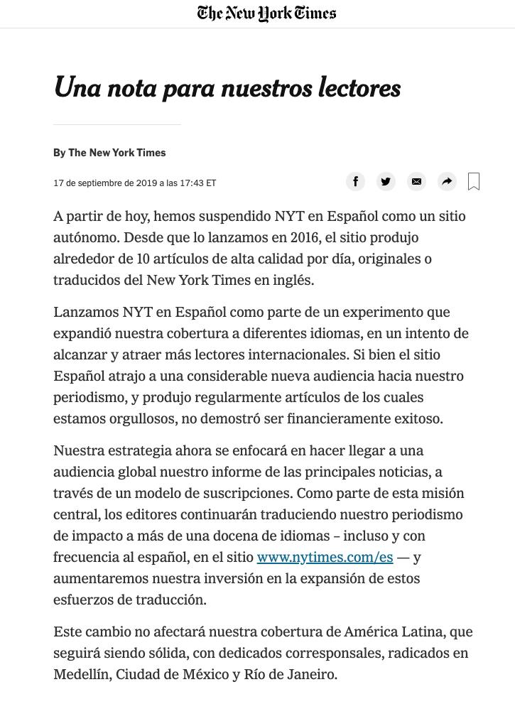 “Si bien el sitio Español atrajo a una considerable nueva audiencia hacia nuestro periodismo, y produjo regularmente artículos de los cuales estamos orgullosos, no demostró ser financieramente exitoso” es una parte del texto que se puede leer en el comunicado que emitió la tarde de ayer, 17 de septiembre.
