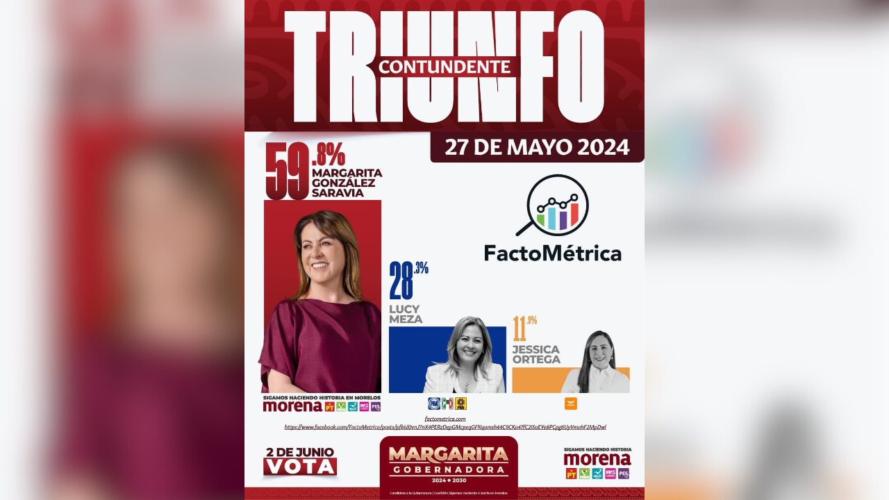 La encuestadora FactoMétrica presentó su última medición electoral para la gubernatura de Morelos, en la que la candidata de Morena, Margarita González Saravia aventaja con 31.5 puntos porcentuales a su más cercana oponente, la aliancista Lucía Meza.