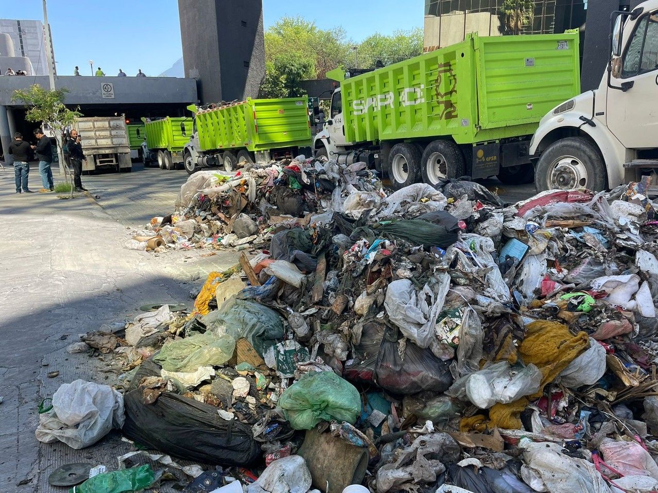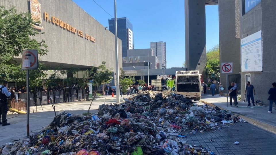 Este jueves trabajadores del Sistema Integral para el Manejo Ecológico y Procesamiento de Desechos descargaron toneladas de basura en el exterior del Congreso local de Nuevo León en protesta por el anuncio de la posible privatización del servicio.