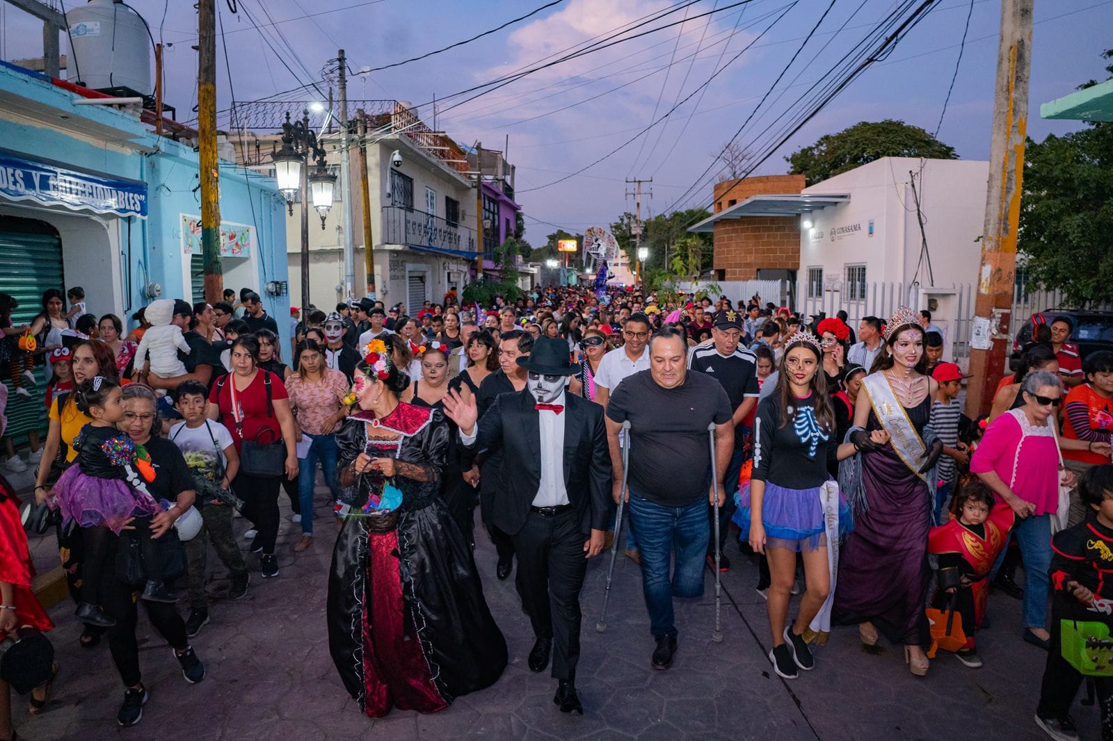 Uno de los momentos destacados fue la “Dulce Petición”, donde un grupo de niños y niñas disfrazados encantó a los asistentes con canciones mientras recibían sus “calaveritas” en los stands instalados por las direcciones del Ayuntamiento a lo largo del recorrido.