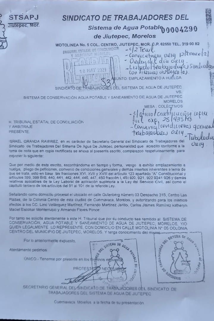 Israel Granda Ramírez, secretario general del STSAPJ, entregó el documento necesario al Tribunal Estatal de Conciliación y Arbitraje, para que hagan del conocimiento al sistema de conservación, agua potable y saneamiento de agua de Jiutepec el emplazamiento a huelga por el incumplimiento de peticiones generales.