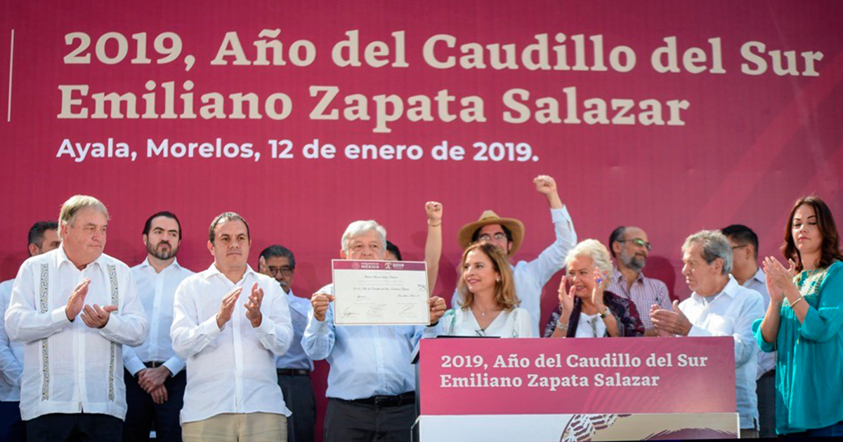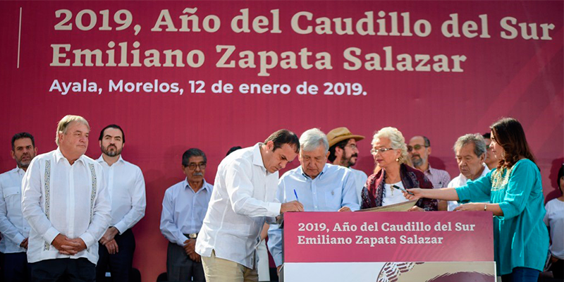 Este sábado el presidente de México, Andrés Manuel López Obrador, visitó el municipio de Ayala en el estado de Morelos, con motivo de la conmemoración del 100 aniversario luctuoso del general Emiliano Zapata Salazar, que será el próximo 10 de abril.Durante el evento el primer mandatario y el gobernador Cuauhtémoc Blanco Bravo firmaron el decreto que declara al año 2019 como el Año del Caudillo del Sur, con el cual la administración estatal y federal se unirán para trabajar regidos por los principios básicos de su legado.Asimismo, el decreto establece que se realizarán actividades en todo el país para difundir esta ideología con la leyenda “2019, Año del Caudillo del Sur, Emiliano Zapata Salazar.”Por su parte el mandatario morelense indicó que al igual que el Caudillo del Sur, su compromiso es generar mejores condiciones de vida para las familias de la entidad, así como revertir los abusos y restituir la paz social en el territorio.López Obrador indicó que analizará la petición del nieto del general Zapata, Jorge Zapata, respecto a cancelar la Central Termoeléctrica de Huexca, obra a la que se han opuesto algunas comunidades de la zona oriente. Mencionó que es un proyecto de la Comisión Federal de Electricidad y su funcionamiento podría representar una considerable reducción al costo de la energía eléctrica de la zona.Asistieron al evento realizado en el Pabellón Turístico Emiliano Zapata, la secretaria de Gobernación, Olga Sánchez Cordero; el presidente de la Mesa Directiva del Congreso de la Unión, Porfirio Muñoz Ledo; senadores y diputados federales por Morelos; el jefe de la Oficina de la Gubernatura, José Manuel Sanz Rivera, el secretario de Gobierno, Pablo Ojeda y autoridades estatales y municipales.