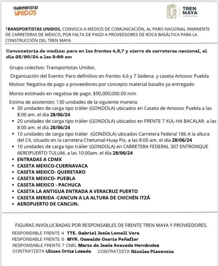 La organización Transportistas Unidos ha comunicado un inminente paro nacional que afectará las principales vías de acceso y carreteras federales en México, en protesta por la falta de pago a proveedores de roca basáltica para el Tren Maya.