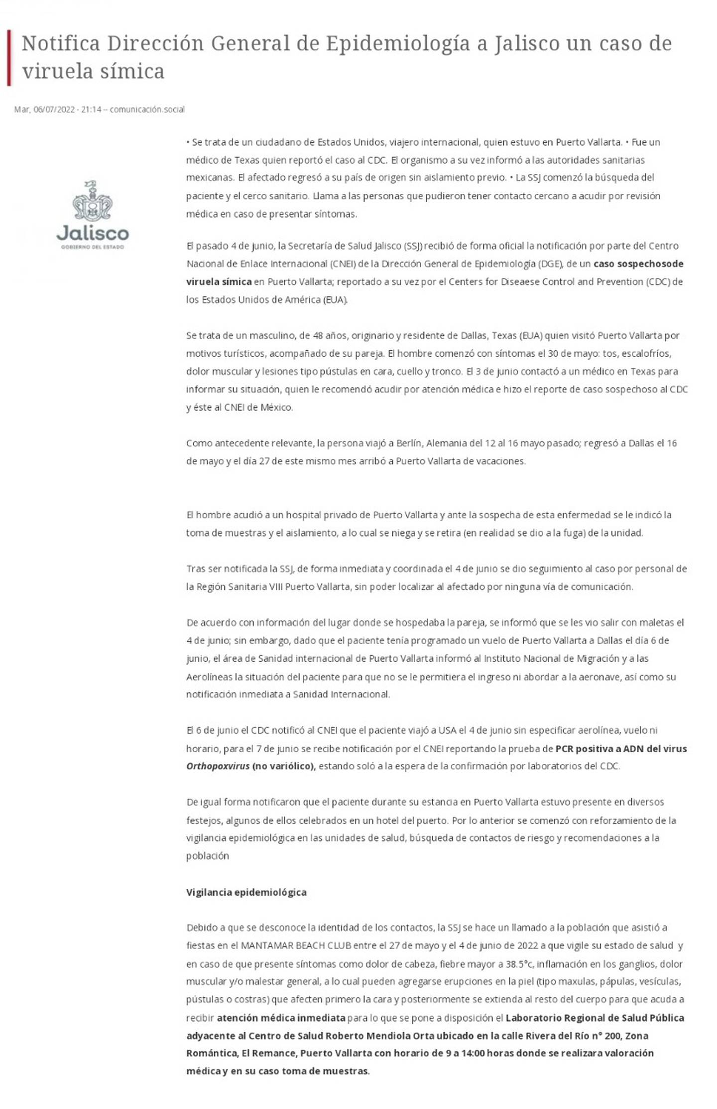 En el comunicado también se informa que el paciente durante su estancia en Puerto Vallarta se hospedó en el Mantamar Beach Club y estuvo presente en diversos festejos. Por lo anterior, la Secretaría de Salud del Estado llama a las personas que pudieron tener contacto cercano a él a acudir por revisión médica en caso de presentar síntomas.