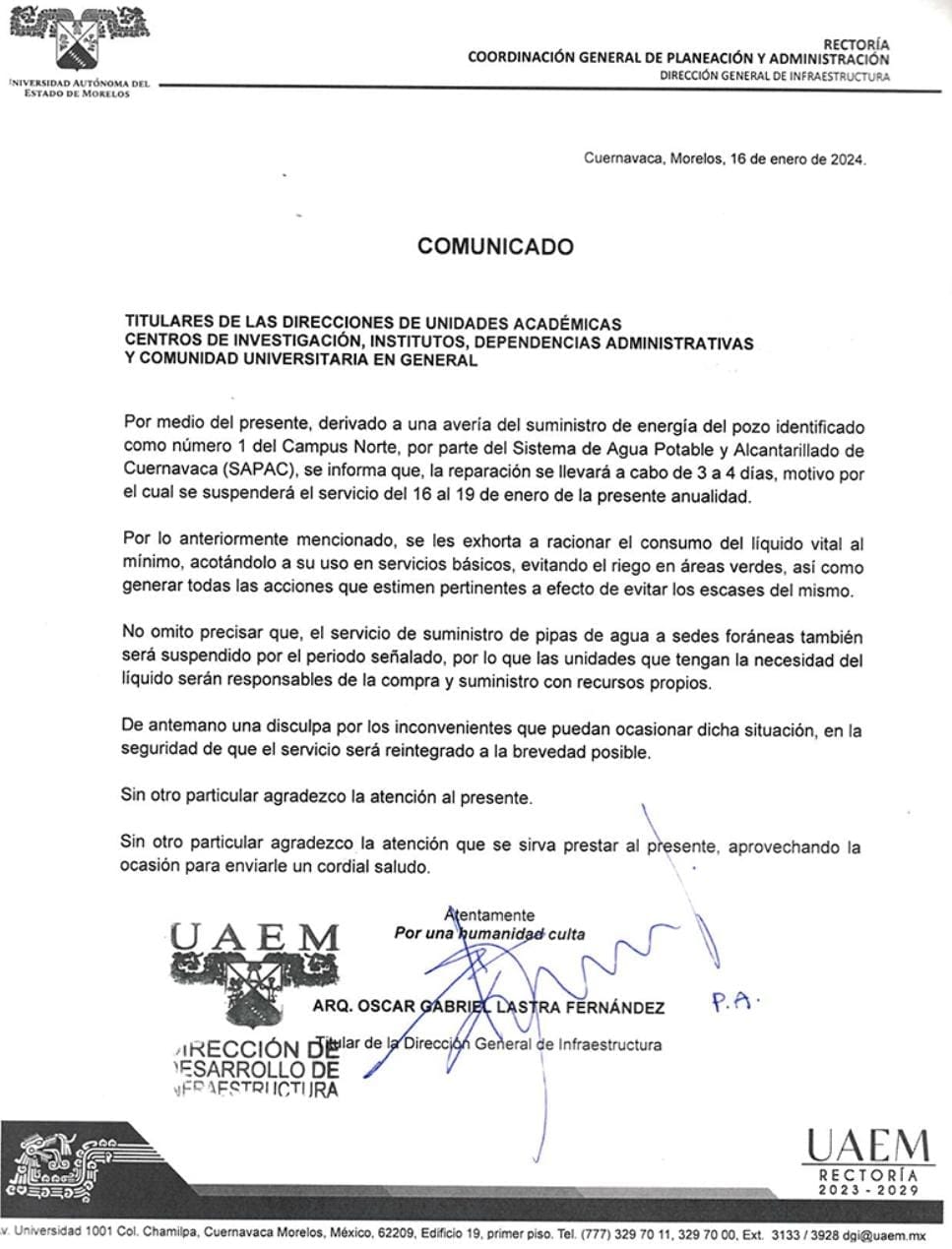A través de un comunicado, el arquitecto Oscar Gabriel Lastra Fernández, director general de infraestructura de la Universidad Autónoma del Estado de Morelos (UAEM), informó que el pozo 1 del Campus Norte presentó algunas fallas, por lo que el Sistema de Agua Potable y Alcantarillado de Cuernavaca (Sapac) procederá a repararlo.