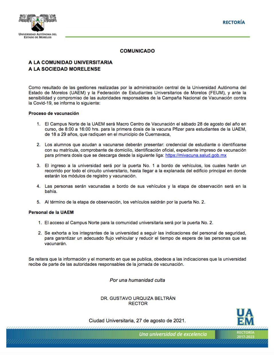 Mediante un comunicado oficial, autoridades de la Universidad Autónoma del Estado de Morelos UAEM y de la Federación de Estudiantes Universitarios FEUM informaron que la comunidad estudiantil de esta máxima casa de estudios será vacunada este sábado 28 de agosto en el macro módulo vehicular del campus Chamilpa, al norte de Cuernavaca.