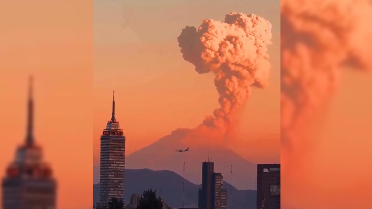 Así se vio el sorprendente atardecer de este viernes en la Ciudad de México. En un video compartido en redes sociales, se puede observar a la Torre Latinoamericana, con el volcán Popocatépetl lanzando una impresionante fumarola al fondo de la imagen, mientras un avión cruza por la escena.