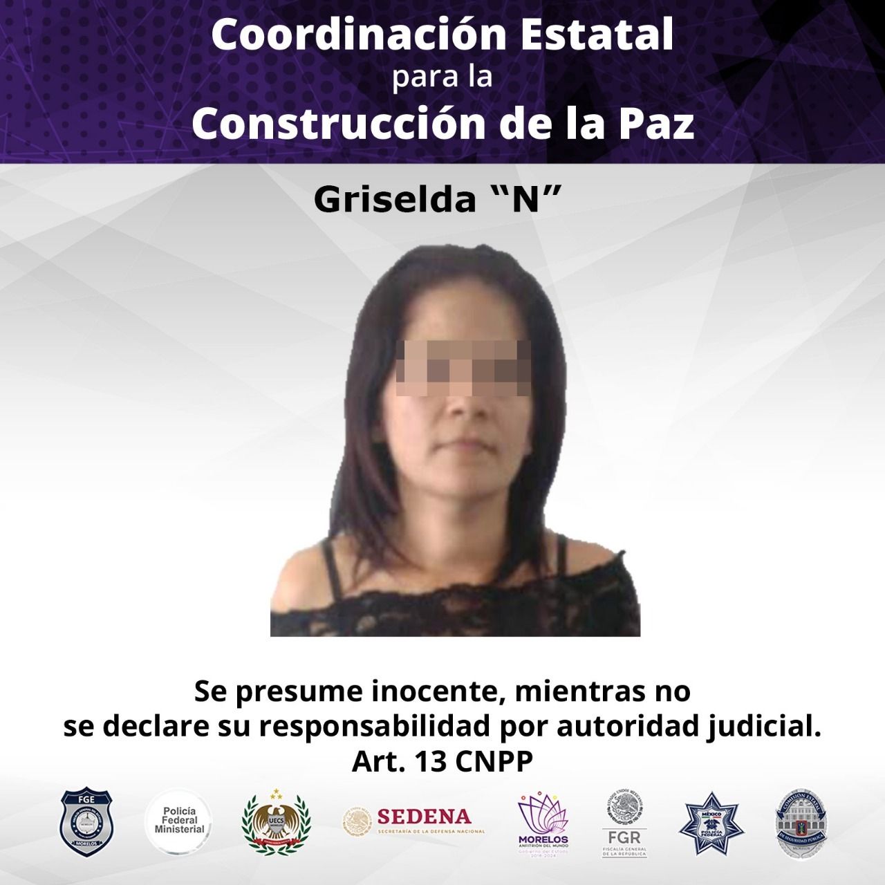 Al lugar arribaron al lugar y lograron detener a Griselda “N” de 44 años en un hotel ubicado sobre la carretera federal México – Cuernavaca, a la altura del poblado de Santa María Ahuacatitlán. La fémina fue trasladada al Centro de Reinserción Social “Morelos” en el poblado de Atlacholoaya, Xochitepec.