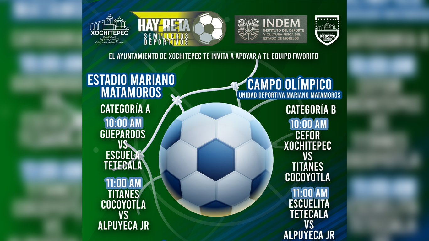 Este sábado 26 de octubre, Xochitepec será el epicentro del deporte con la celebración del torneo de fútbol “Hay Reta”, organizado por el Instituto del Deporte y Cultura Física del Estado de Morelos (INDEM), en colaboración con el ayuntamiento de Xochitepec bajo el gobierno de Roberto Chalo Flores.