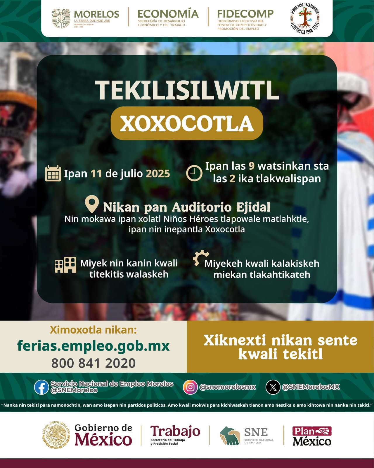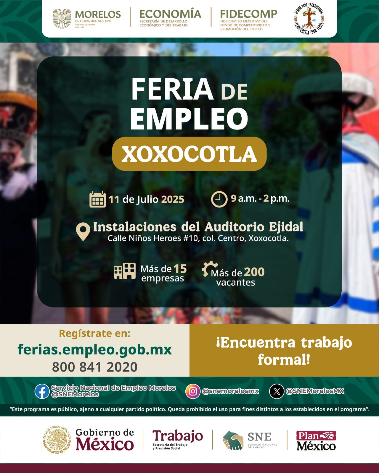 Este viernes 11 de julio, de 09:00 a 14:00 horas, el Auditorio Ejidal de Xoxocotla será sede de la Feria de Empleo 2025, organizada por el Gobierno de Morelos, a través de la Secretaría de Desarrollo Económico y del Trabajo (SDEyT) y el Servicio Nacional de Empleo (SNE).